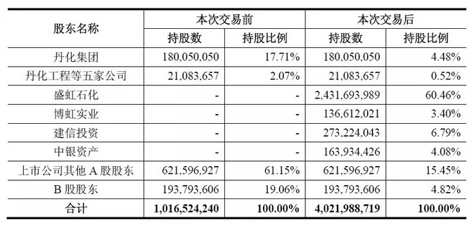 交易前,丹化科技实控人为江苏省丹阳市人民政府,持股比例19.79%,斯尔邦隶属盛虹集团。交易完成后,丹化科技将持有斯尔邦100%的股权,公司控股股东将变更为盛虹集团,实控人将变为缪汉根、朱红梅夫妇。
