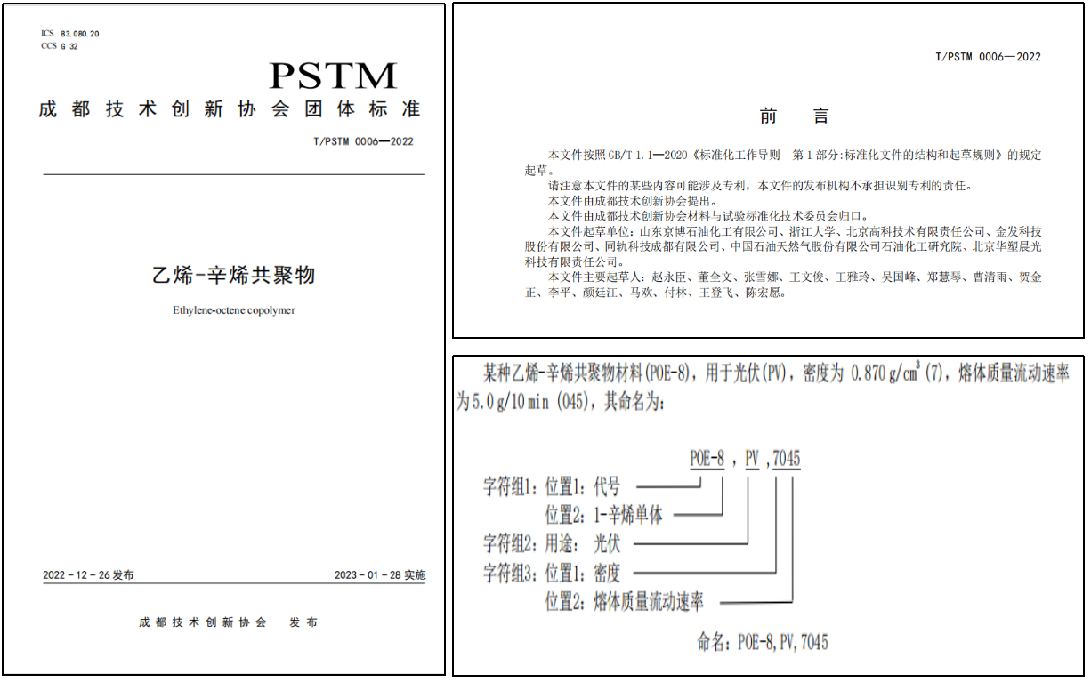 该标准由京博石化牵头起草,由成都技术创新协会材料与试验标准化技术委员会归口,浙江大学、北京高科技术有限责任公司、金发科技股份有限公司、同轨科技成都有限公司、中国石油天然气股份有限公司石油化工研究院、北京华塑晨光科技有限责任公司共同参与起草,于2023年1月28日正式实施。标准规定了乙烯-辛烯共聚物的命名、要求、试验方法、检验规则、标志和随行文件、包装、运输和贮存。标准适用于由乙烯与 1-辛烯通过溶液聚合工艺所生产的乙烯-辛烯共聚物,共规定了通用及光伏用途的5种牌号产品,选取熔体质量流动速率最具代表性的三个标称值范围进行要求,可代表市面上大多数产品要求。