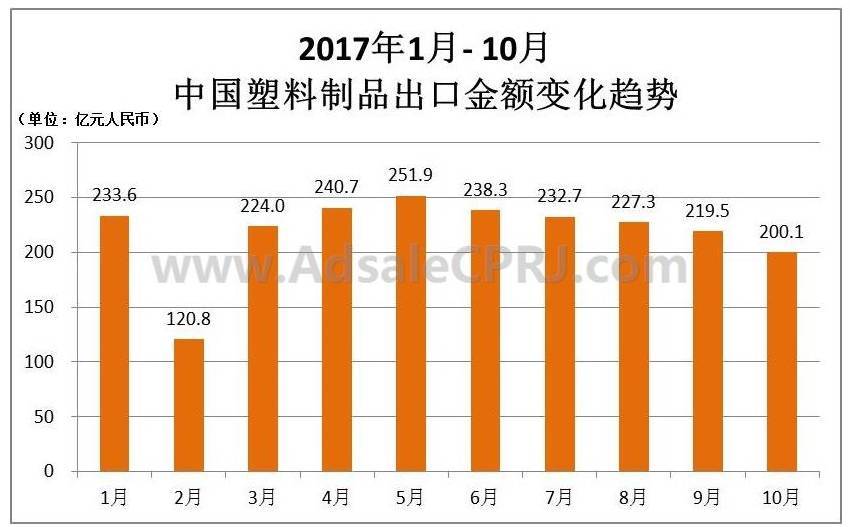 10月塑料制品出口200亿元,同比微增0.76%