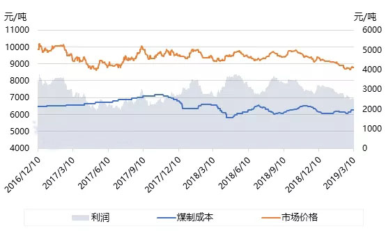由上图可见,进入2019年,煤制聚乙烯的生产利润逐渐减少。而增值税的降低,对西北生产企业来说,意味着运输成本或有所降低,如当前运送到山东地区销售大约需要300元/吨的运输成本,降税后或将减少3元/吨,这就进一步增加了煤化工生产企业的利润空间。