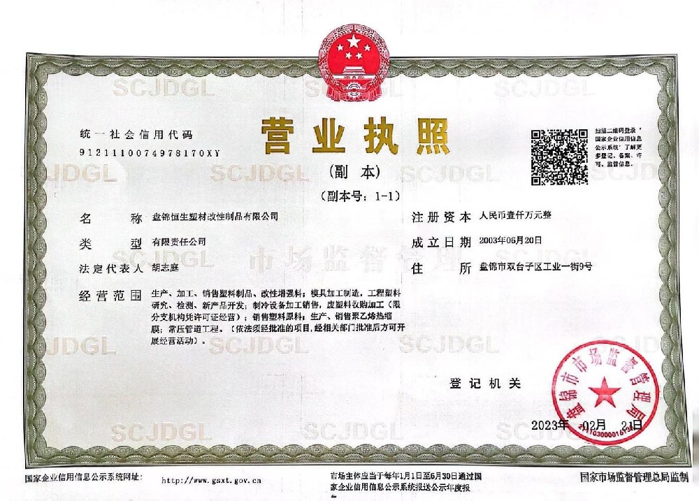 盘锦恒生塑材改性制品有限公司坐落在辽宁省盘锦精细化工产业开发区,总占地面积21000平方米,年生产能力在 3 万吨,是辽宁省生产制造全系列塑料制品的高科技研发型企业。